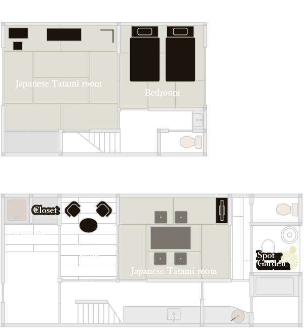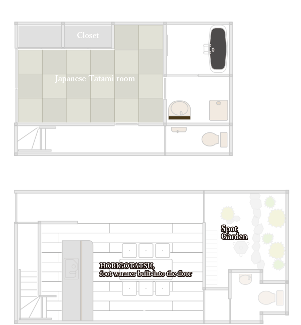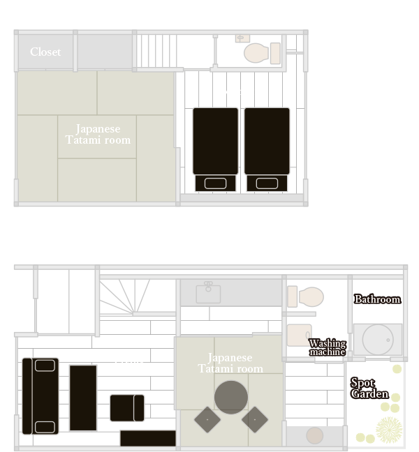 | 卧室 | 2楼:和室中单人床两张,被褥3套 1楼:和室中被褥2套 2楼两个房间相邻,可隔断成两个房间,且出口各异,互不打扰 1楼隔断后也是独立的房间,出入厨房和浴室等都不会打扰 6名以上客人入住时,我们会在1楼准备被褥。 5名以下的客人,如需1楼准备被褥请提前通知。 免费的陪睡儿童如需增加被褥,一套2,000日元(含税) 7套以内 |